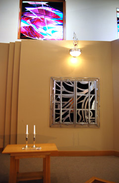 In the sanctuary, a DNA double helix above an off-center Torah symbolically places authority with humanity, the congregation.