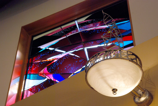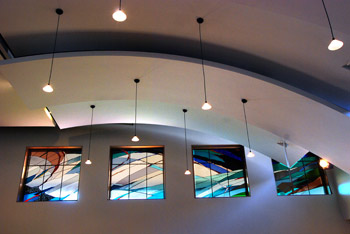 And high above the pews, an impressionistic explosion of colors wraps around the walls in a series of stained glass windows that depict the Big Bang, evolution of the universe, our world, and ultimately, us.