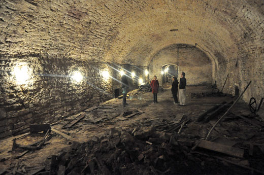 It’s not just the upstairs, however. The real killer assets at Cosmopolitan Hall are the two vast sub-level basements. The first level down features some rathskellar-like stone alcoves and looks like it may have housed some of the old bowling alleys that existed during livelier times. Also an odd assortment of incredibly heavy and inert machinery and archaic equipment remains scattered about (3CDC sub-contractors apparently filled up untold numbers of dumpsters with rubbish last year while cleaning out the building). Hiking west toward the rear of the first basement level, we reach the Republic Street end, where a long ladder (next to a non-functioning freight elevator) awaits. Descending down to the second sub-level, our expedition arrives at an amazing, 4,400 square foot, two-chambered vault running the length of the building. Twenty foot, barrel-vaulted stone ceilings arch overhead, while a trail of minor rubble and debris fans out in front of us.