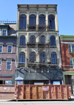Walking up Vine from Central Parkway, not far from the path of the streetcar route, you will pass through the rapidly evolving Gateway Quarter. The success of its rehabbed condos and new retail shops has been well documented, while the ongoing buzz of construction activity continues unabated both on Vine and nearby Republic Street. To its credit, 3CDC owns or controls approximately 152 buildings and 165 vacant parcels in Over-the-Rhine, acquiring, cleaning out and securing the structures in order to facilitate development. In a tidy lunchtime exercise in urban spelunking, I recently had the opportunity to visit but one of these structures, the 1855 era Italianate Revival classic known as Cosmopolitan Hall (1313 Vine Street).