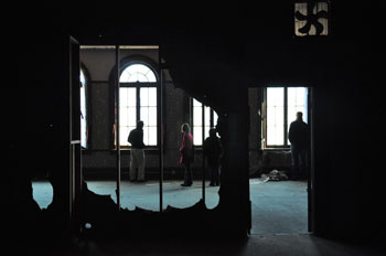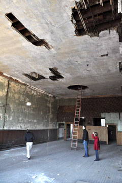 Walking into the old Warehouse nightclub space, painted in basic “club black” with the lint-enhancing glow of purplish black lights still flickering, it’s hard to imagine the building as it was in its heyday. Once you ascend the grand center staircase to the second floor music hall, however, the whole place opens up. The huge room, elevated stage, 25 foot ceilings with windows encircling the top elevation is a stunner, albeit in a somewhat dilapidated state. The rooms fronting Vine, with the high ceilings, original windows and abundant light are like something out of a movie set (“shoot your album cover here”). Although some water damage is evident, 3CDC, in their mission to secure the building, has been working diligently to shore up any intrusions of unwelcome moisture (the roof was being worked on as we were there). From the huge rear windows on the 4th floor, one can gaze across a Dickensian scene of scattered uneven chimney stacks and varying rooftops to see the soaring apex of Music Hall. Stunning, really.