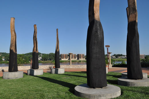 But mayhaps I’m rambling a tad with all the skewering and such….so back to my original topic, Cincinnati’s park system. Last Friday evening was one of those perfect confluences of early summer, sunny, warm, cool at night, clear skies…and a wine tasting and tour of several parks courtesy of the Cincinnati Parks Board. Dubbed Views & Vines, the fundraiser bivouacked initially at Mt. Echo, on the near west side, with wines from Tino Vino and assorted hors d’oeuvres. If you have never been to Mt. Echo, it’s an easy trip up, and the views of the city and the bowing curve of the river are indeed as good as advertised. From there, the moveable feast packed into a cadre of tour busses, accompanied by a police escort, and motored quickly over to the Ted Berry International Friendship Park along the river. This park, Cincinnati’s newest, has really come into its own with the art installations and riverside trail. It also provides a nice green counterweight to some of the unattractive (for now at least) condo structures rising on the Northern Kentucky side of the river. In the park center, we were treated to yet another wine offering, as well as food from Andy’s Mediterranean Grille. Bonus fact, I did not realize the curved benches in this park were inspired by Gaudi’s Park Güell in Barcelona.