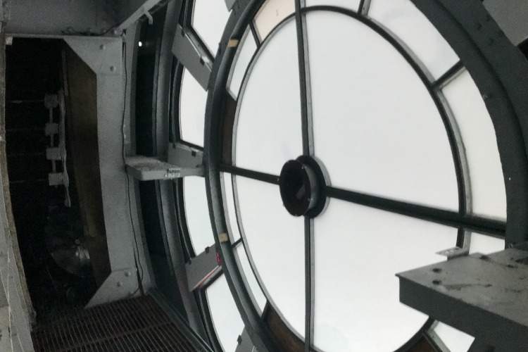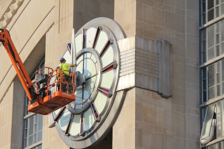 The clock is mounted in the building’s façade. It has a diameter of 18 feet and is composed of more than 50 amber and red glass panels. The hands glow neon. In 85 years, this is the first time it has been refurbished. The entire piece had to be disassembled and taken, by hand, down multiple flights of stairs to be worked on. A different contractor, Centennial Preservation Group, worked alongside Verdin for the clock restoration. They handled the reglazing of the clock panels and sealing them into the metal frames. After the work had been done, it took days for the team to reassemble in place. It is now installed and operational. The glowing hands will be lit soon.