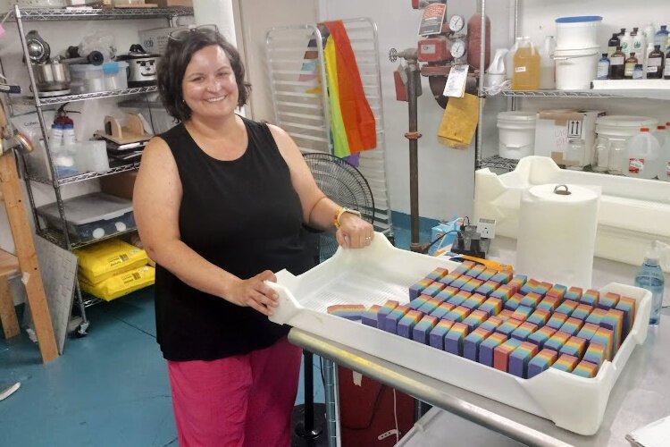 In honor of Pride Month, Laura produced three special-edition bars: rainbow-colored lemongrass, a red, white, and blue bergamot and lime, and red, yellow, and blue raspberry lemonade. A portion of the sale of each Pride bar is donated to Transform, which provides free clothing, style assistance, and other support and resources for trans and nonbinary kids and teens.