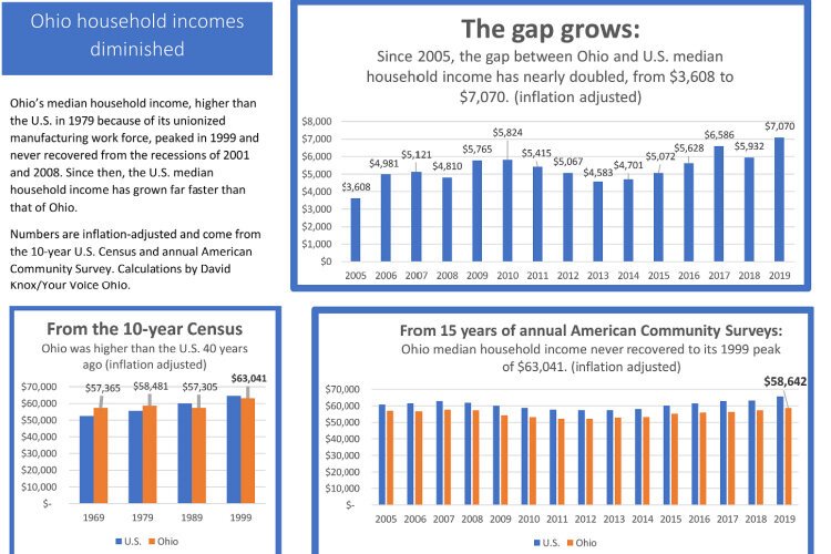 And Ohio has tumbled in relation to the nation. In 1999, median household income was about 2.4% below the U.S. median, but by 2019 the gap had more than tripled to 9%.
