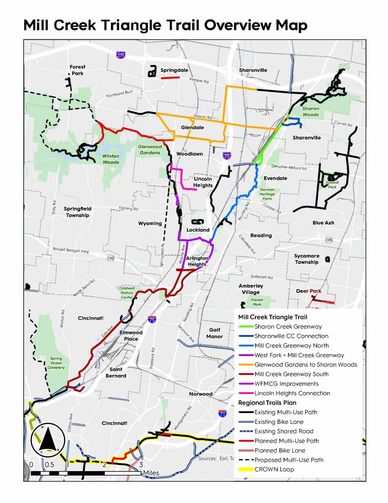 Dubbed the Triangle Trail, the path would run north from the Cincinnati neighborhood of Spring Grove village, and one branch would link communities along the Mill Creek, including Arlington Heights, Lockland, Lincoln Heights and Woodlawn. Another branch would run to the northeast, connecting Reading, Evendale, Sharonville, and other towns.