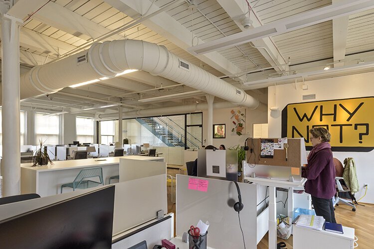 • In a meeting room nestled on the second floor, ArtWorks has dedicated a meeting room to celebrating Bolce’s history with custom-designed wallpaper that features the Bolce logo and the visage of founder Louis Bolce. Vestiges include a vintage Crosley refrigerator (another erstwhile local icon), and countertops and furniture decorated with cans sleeved with reproductions of Bolce Paint labels.