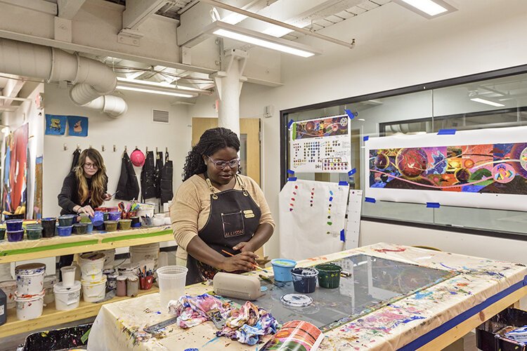 ArtWorks’ new home accommodates seven separate studios, which provides the opportunity for employment of up to 100 young local artists year-round. During a Tuesday morning visit, one of its basement studios was alive with activity. A pair of young artists, Kelsey Wood of Madisonville and Lauryn Campbell of Clifton, were designing and painting a mural designed by local artist Sherman Parnell for installation at Thermo-Fisher Scientific’s Cincinnati office.