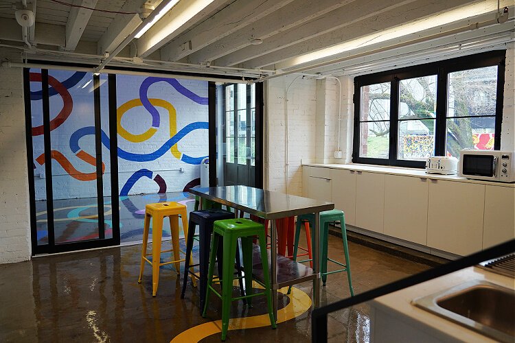 • The building’s former loading dock, with a roll-up from which delivery docks were dispatched into the world with paint cans containing an endless array of hues, has been embellished by serpentine, multi-colored lines designed by the Brooklyn studio CHIAOZZA and bedecked by ArtWorks’ studio artists. A vertical lighting-art installment of programmable, changeable-color luminous tubing designed by local lighting designer 37 Volts, creates a constantly evolving vibe.