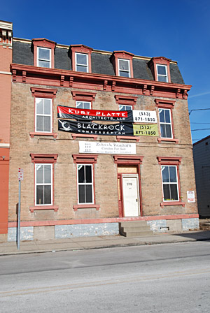 Kurt Platte Architects and Black Rock Construction are quietly creating five new condo units in a historic Northside building.Work began three months ago on Blue Rock Flats at 1726 Blue Rock Street, with units listed from between $99,000 for one-bedroom first floor units to $145,000 for the two-bedroom penthouse.”We were attracted to the area by the diversity and open mindedness of the residents and the hipness of the neighborhood,” Platte says.  “The building shell has great character with its pale brick and cast stone lintels.  And it’s unusual to find a property in a dense urban setting that has space for off-street parking.”  The building, which had housed multi-family apartments, had to be gutted to create a new layout.”In order to create a third floor penthouse we tore off two-thirds of the roof, reframed the middle of the third floor with a flying roof, leaving the back one-third of the third floor as an open roof terrace surrounded by brick walls,” Platte says.  “We eliminated the interior stair to maximize the floor area and built an exterior rear stair with private outdoor garden decks.”Platte was able to save as much of this historic fabric as possible.”We found wood floors on the first floor that can be refinished,” he says.  “We found 4-by-8 old original pocket doors that we will use as the front door at the sidewalk level, replacing some tacky aluminum infill door and rotten sidelight.  The brick we exposed from the interior is great looking and adds so much character.  We exposed more than we originally planned because it was that attractive.  The chimney pots at the third floor rooftop terrace were able to be saved.”A barn on the rear of the property will be converted into a live/work artist loft.Platte estimates that the project will be completed by April or May.Writer: Kevin LeMasterSource: Kurt Platte, Kurt Platte Architects Photography by Scott Beseler