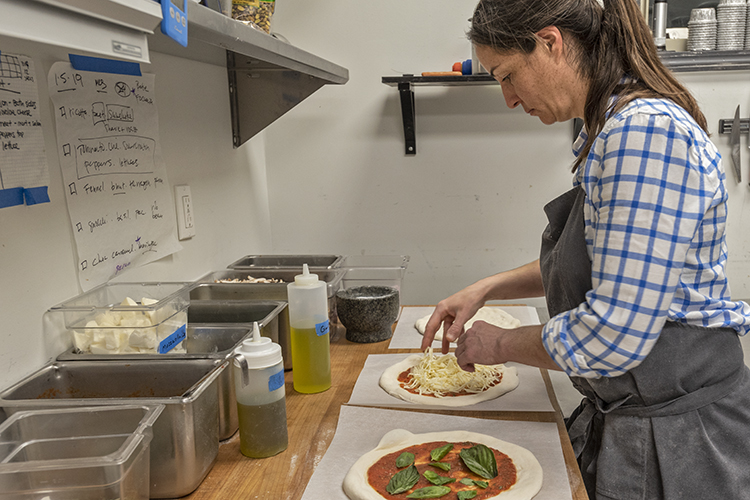 “I’ve always wanted to open a pizza parlor,” she says as she tops a small pizza then slides it in the oven. The pizzas are a nice treat for those on the list who didn’t make the dinner cut-off.