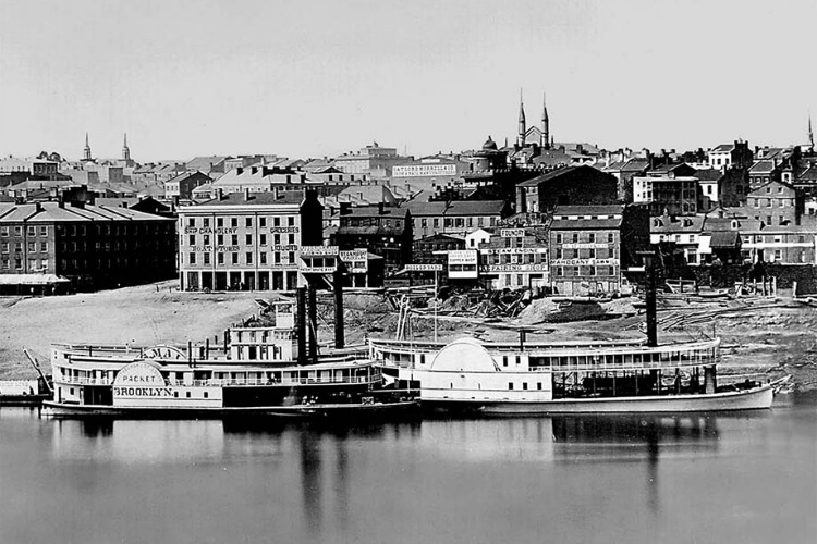 This carefully preserved “Daguerreotype View of Cincinnati” is a sweeping vista of the Queen City in 1848. Taken from the Kentucky side, it manages to capture a total of thirty-two riverboats within its two-mile span. You can count them.