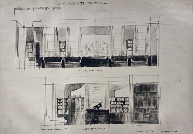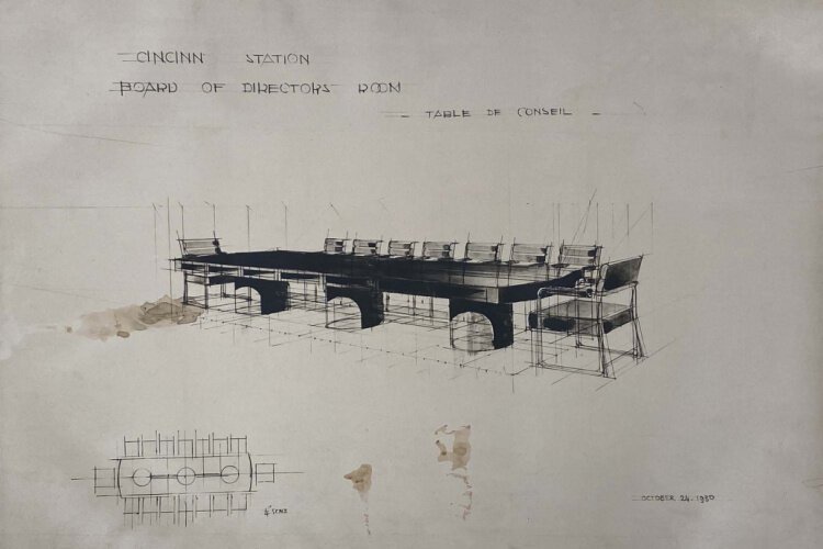 The CMC recently gained the opportunity to let design students, history buffs and anyone with an interest in Cincinnati history appreciate a new collection of documents now in the Center’s possession that highlight the work of Edgard Sforzina, a French-born architect and interior designer who devised Union Terminal’s boardroom and president’s office. According to Sarah Staples, the CMC’s Helen Steiner Rice archivist, the Center’s process of procuring the documents includes sketches, drawings, and correspondence. Denise Allen, Sforzina’s granddaughter, reached out to the Cincinnati History Library and Archive early during the COVID-19 pandemic offering the collection.
