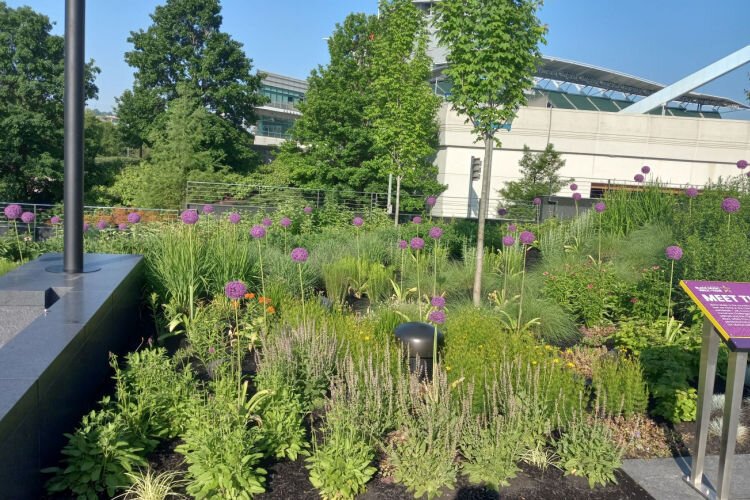 West Chester-based Kleingers Group executed the Walk’s landscape architecture and the engineering of the site’s storm-drainage system. The flora’s design emphasizes resilient plants with staggered blooming seasons to maintain brilliant hues. Purple spherical alliums were the stars on this mid-May day.