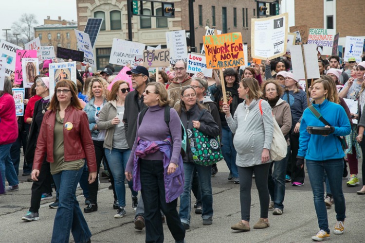 A rambunctious crowd chanted: “Tell me what democracy looks like! This is what democracy looks like!” through the streets of downtown, waving signs printed with concerns about immigration, affordable healthcare, climate change, reproductive rights, and racial equality.