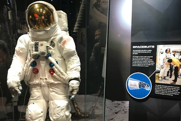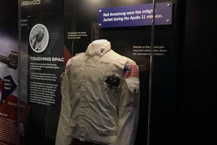 Objects on display include an Apollo communications cap, an exact replica space suit, Neil Armstrong’s Apollo 11 inflight jacket, and a rare moon rock sample named Bok.