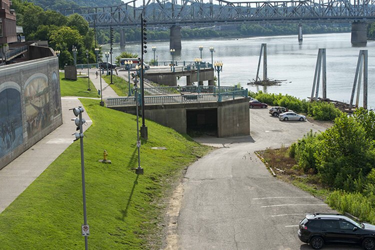 - Two concrete ADA-compliant multi-use paths — totaling about 2,800 feet — stretching from Greenup Street to the Madison Overlook, where they will link up with a sidewalk that leads west to a previously built paved path. The lower path will run along the river’s edge; the upper path will follow along the floodwall murals.