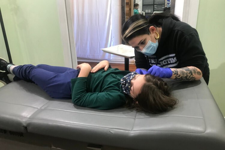 Vicki Geraci stands over a 10-year-old, first-time piercing client and talks about consent.