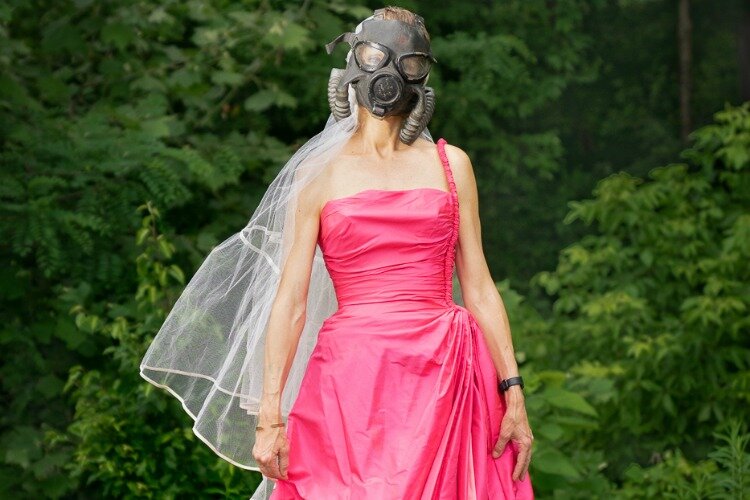 “The gas mask speaks for itself,” she adds. “I appreciate its contrast to my mother’s prom dress. Seriousness and some frivolity. We need to find a balance.”
