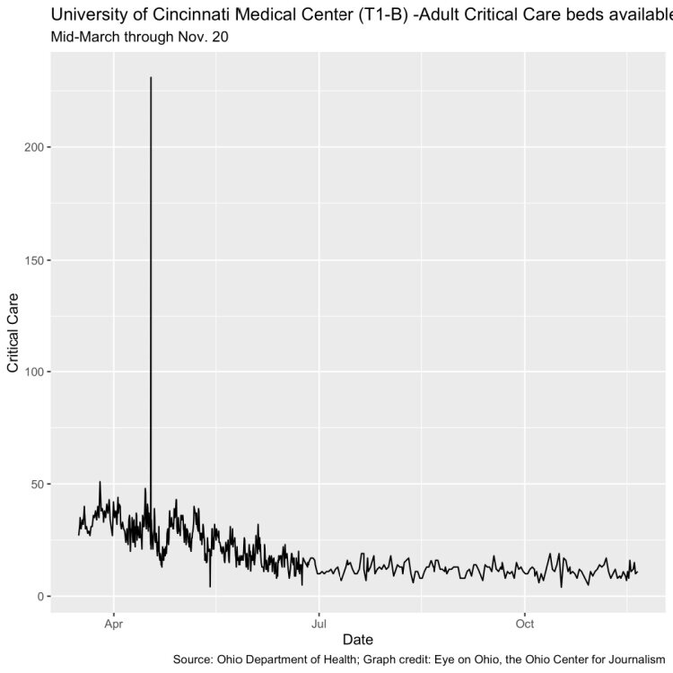 On March 19, Ohio postponed all elective surgeries, causing a large spike in hospital beds available. On June 2, Ohio resumed other procedures. In early November, hospital officials announced they would start transferring patients to other systems to help even out patient loads.