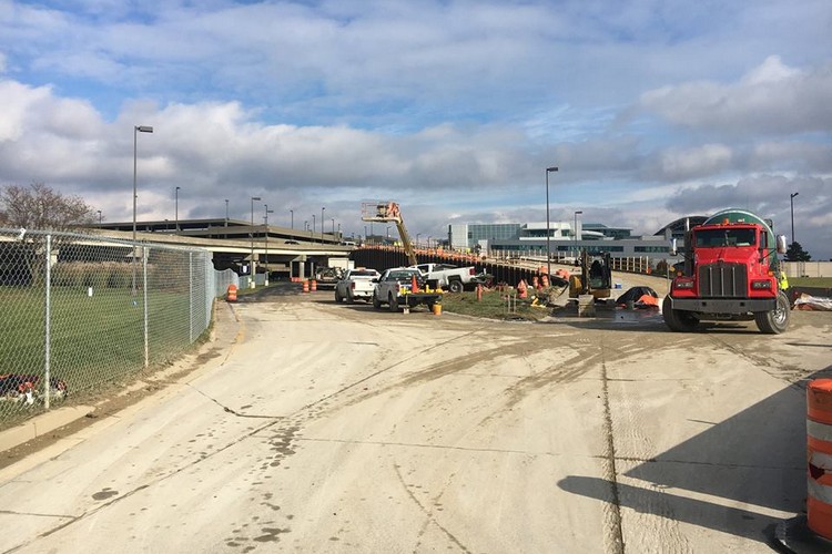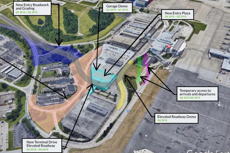 Since August, crews have been working at removing the west end of the CVG parking garage and changing the departure ramp structure and the entrance and exit areas to garage parking. The road and garage work is all estimated to be completed by this coming November, with the entrance road being permanently rerouted up a corridor between the CVG garage and the on-site hotel, the Doubletree by Hilton.