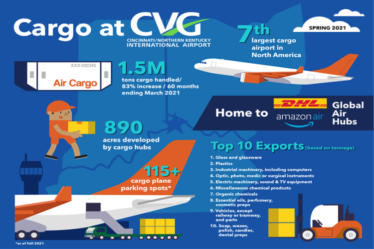 “There are some interesting stats on the cargo front,” says Kershner, CVG’s senior manager of communications. Looking at the five years between 2016 and 2020, “we saw 83% growth in the cargo side.”