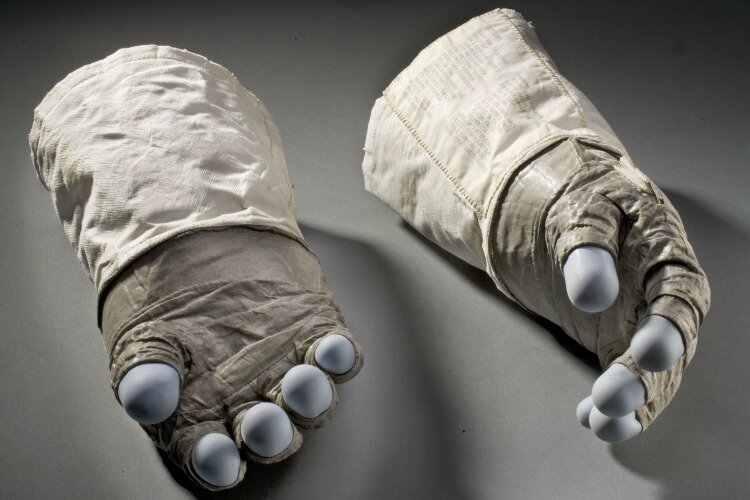 While the Apollo 11 space suits were too delicate to travel with the exhibit, Buzz Aldrin’s EVA gloves and helmet are included. Halpern notes that, through a magnifying lens, visitors can read a reminder list written on Aldrin’s glove. Among the reminders is one to “photograph boot print.”