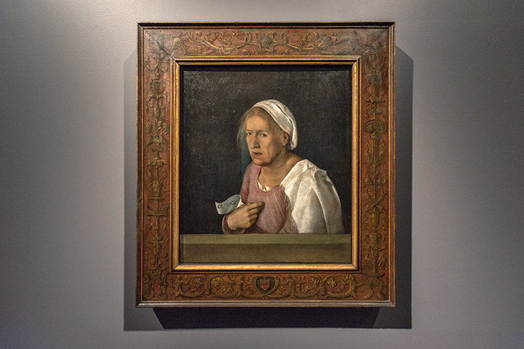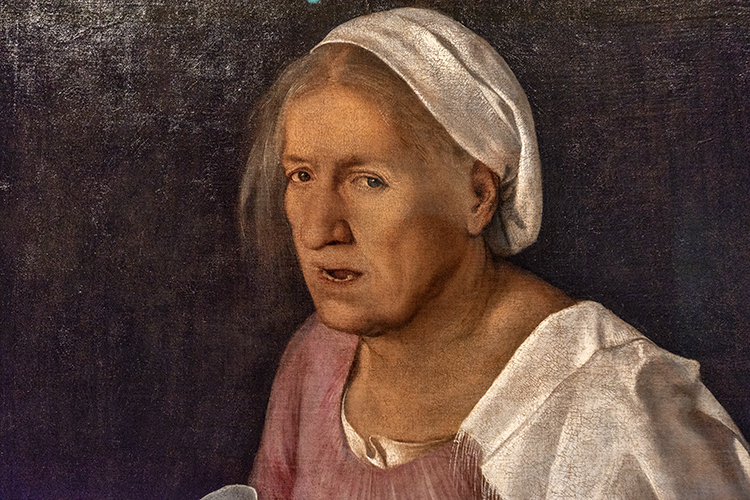 Giorgione’s subject is an elderly woman who remains nameless. She looks directly at the viewer, whom she appears to be speaking to. “Her gaze meets our gaze,” Bell says.