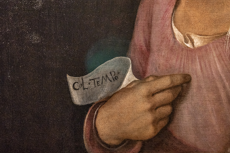 She is pointing to herself. A slip of paper emerges from her sleeve with the words “col tempo,” or “with time.”