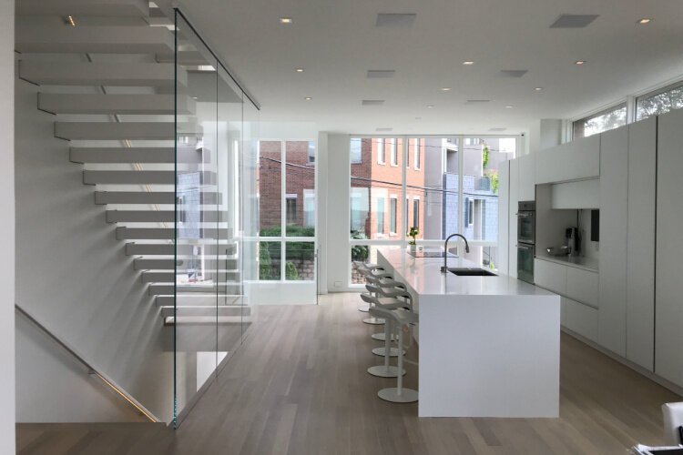 Bronzie is expert in building homes with complicated architectural features and the cantilevered staircase was a supreme challenge. Inviting staircases, such as this one, found in sustainable buildings that encourage taking the stairs are called “irresistible stairs.” Renan says architect Chad Puckett with Fold and Form was a great listener for their exploration of minimalist possibilities.