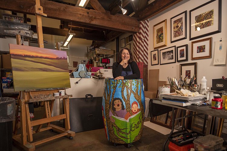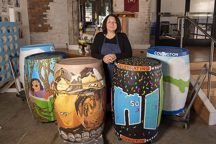 Jennifer Baldwin, an accomplished artist, retired Dixie Heights High School art teacher, and professional framer, is busy finishing up five barrels for the project. Among them is one for altafiber, formerly Cincinnati Bell, which has fibers weaving in and out of Northern Kentucky buildings.