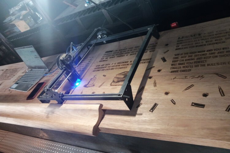 With an opening targeted for early spring, a walk through Annie Oakley’s swinging doors feels like a walk back in time. Woodworking reclaimed from old houses and churches, including the original factory’s front door, provides a rugged ambience. Bar manager Britton de la Chapelle intricately laser-etched graphics into Annie Oakley’s mahogany bar that highlight Annie Oakley’s colorful life story and skill. Behind the bar, bourbon and whiskey (if you know the difference, you know) will be the star performers with a full bar, beer and wine. Childers said an Old Fashioned would be its signature libation.