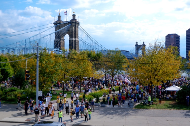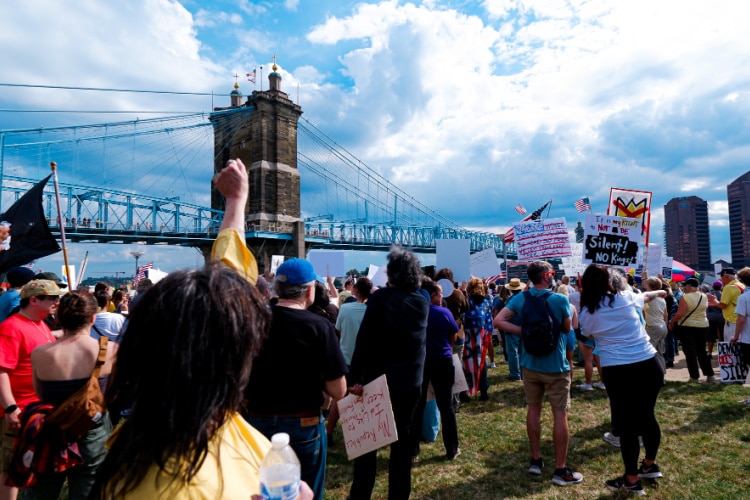 It was a warm fall day on the Cincinnati riverfront, the kind that makes Cincinnati believe everything is fine. Beneath the blue span of the Roebling Bridge, people gathered at Smale Riverfront Park holding handmade signs that read We Have No Kings. The breeze off the Ohio River carried chants, traffic, and neighbors trading half-jokes about where they’d rather be spending their Saturday, but they were here with their community, “locking it in,” and making their voices heard.