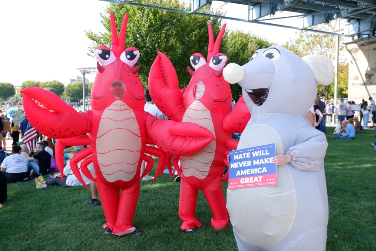 Police kept their distance as the rally unfolded peacefully. Despite national rhetoric describing the protests as angry or divisive, Cincinnati’s participants showed the opposite. People came in blow-up dinosaur suits and homemade costumes covered in peace symbols.