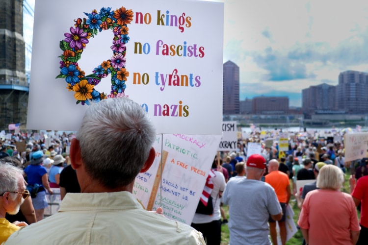 LORIE-BAKER – Thousands of people gathered for No Kings in Cincinnati on Oct. 18, 2025. A sign near the Roebling Bridge reads: “No kings, no fascists, no tyrants, no Nazis.”