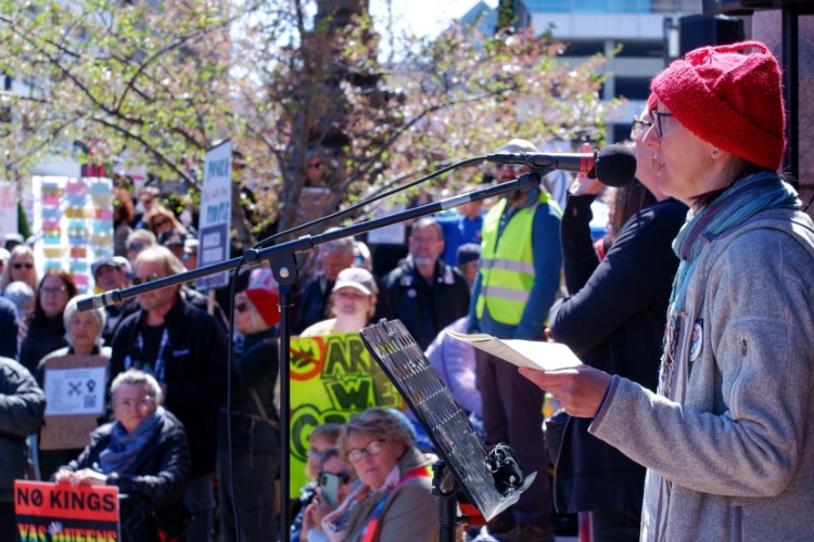 Speakers addressed the fragility of democracy and authoritarianism. Civic organizations recruited people for voter registration, mutual aid, nonviolent disruption, strikes, boycotts and other coordinated-action efforts.