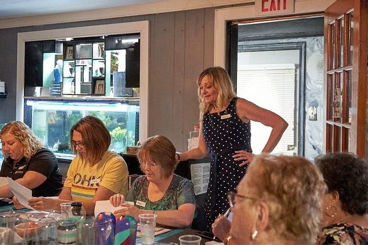 Provided – Angela Regan (standing) at Welcome Home SIS fundraiser with guests (from left) Emily Vigue from the Foundation for Appalachian Ohio, Lana Perry from Perry insurance, and Toni Kellar from Newsight Life.