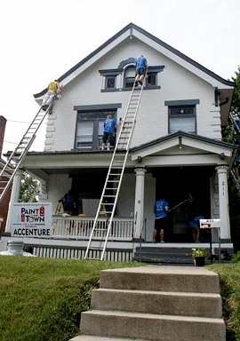 Applications are now available for Give Back Cincinnati’s eighth annual Paint the Town event, which will take place this June 13 in Price Hill.This year, the goal is to paint the exteriors of between 50 and 60 owner-occupied homes for those who are physically or financially unable to do the work themselves.”We have mailed applications to a couple of areas where we already have community enhancement programs in place in order to heighten the impact there,” says Matt Strauss, director of the Price Hill Housing Resource Center. “We’re also working with the Building Department. They’ve sent us a list of every house in the Price Hills that has a code violation for peeling paint and we’re mailing applications to them.”Over 1,000 volunteers are expected to participate, and Price Hill Will and Santa Maria Community Services are partnering with Paint the Town to maximize the impact of the project.Joe Hansbauer of Paint the Town says that they expect to see an influx of applications this year because of the economy, and Strauss agrees.”The less your home is worth the less you can borrow,” Strauss says. “By painting someone’s house and helping to increase the value of that home we’re putting people on more stable economic footing. And it makes Price Hill a better investment for a buyer and for a current owner.”Paint the Town’s ultimate goal is to impact the overall community.”The simple coat of paint has a domino effect in the community,” Hansbauer says. “It’s amazing to see a street that is run down, and you bring 25 volunteers out to a house and begin painting. All of a sudden the neighbors next door are picking up their child’s toys left in the yard, sweeping the front porch and doing general maintenance to their homes.”Applications will be accepted through February 14.Since its founding, Paint the Town has painted a total of 170 homes in eight Greater Cincinnati communities.Writer: Kevin LeMasterSources: Matt Strauss, director, Price Hill Housing Resource Center; Joe Hansbauer, Paint the Town Photography provided by Paint the Town online photo galleries