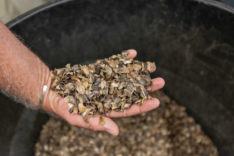 Next, the plants progress through a mulcher before getting sifted. The sifting separates the seeds from the excess plant matter. Seeds are then collected, weighed, and documented before going into the climate-controlled storage room which maintains moderate temperatures and low humidity year-round.