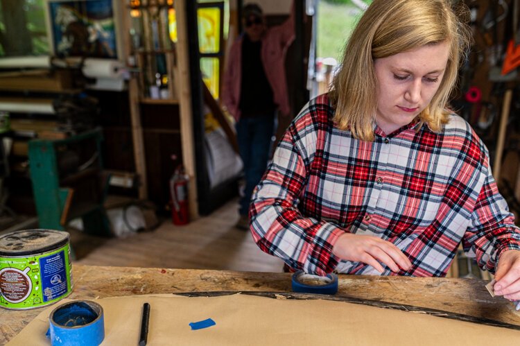 Sarah Cousino, 25, learned carpentry from a young age from her father, a woodworker. A self-professed glutton for knowledge, she wants to learn every skill she can. She has always been interested in stained glass and jumped at the opportunity to learn from an expert like Rasche.