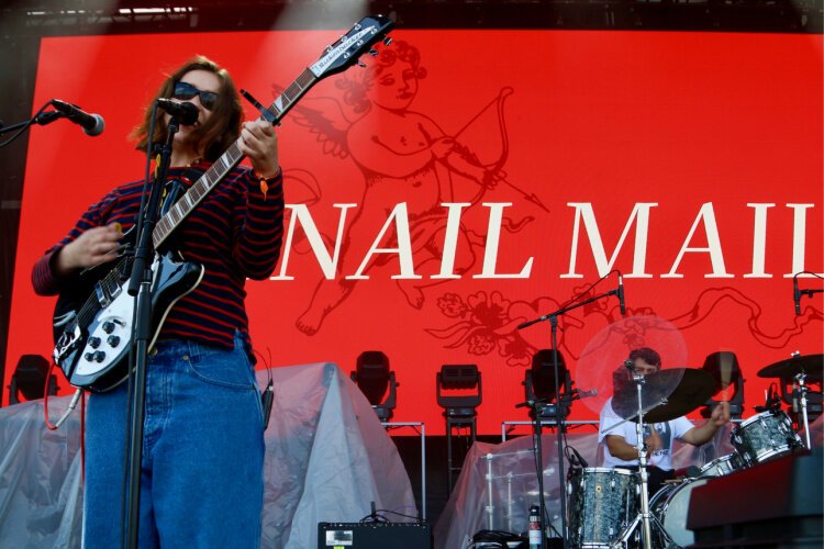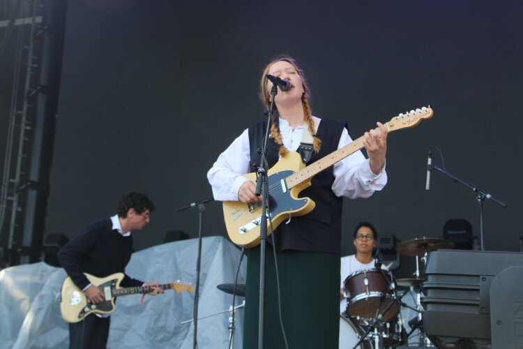 Weyes Blood, the performing name of Natalie Mering, epitomized the word “ethereal.” She glided around the stage, a white-magic counterpoint to Stevie Nicks’s black-lace wiccan ways. Or maybe a less New Age-y Enya. She proclaimed that her last three tracks would be “the rave portion” of the set. That it was still daylight didn’t matter. The audience responded favorably, cheering her on as she tossed roses into the audience, twirling and flinging the flowers with abandon amid a few candelabras onstage. Her singing was soothing, captivating, lovely. She summoned other young female artists, such as Mitski, Japanese Breakfast’s Michelle Zauner, and possibly, Dry Cleaning’s Florence Shaw, who aren’t afraid to bring theatrical tastes and elements and occasional dance moves to their performances. At Homecoming, many young women turned in solid performances, including Australian-native Julia Jacklin and Snail Mail’s 24-year-old Lindsey Jordan.