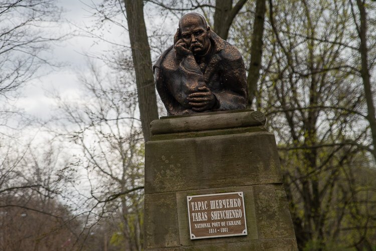 A full-length statue honors Larysa Petrina Kosach Kvitka, a renowned poet best known by her pseudonym Lesya Ukrainka. Born in 1871, she grew up in era when publication in the Ukrainian language was forbidden in the Russian Empire.