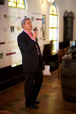 Casey Barach, co-founder of UpTech and Vice President for Entrepreneurship at Northern Kentucky Tri-ED, addresses the crowd at the celebration for UpTech winners at Newport Hofbrauhaus.