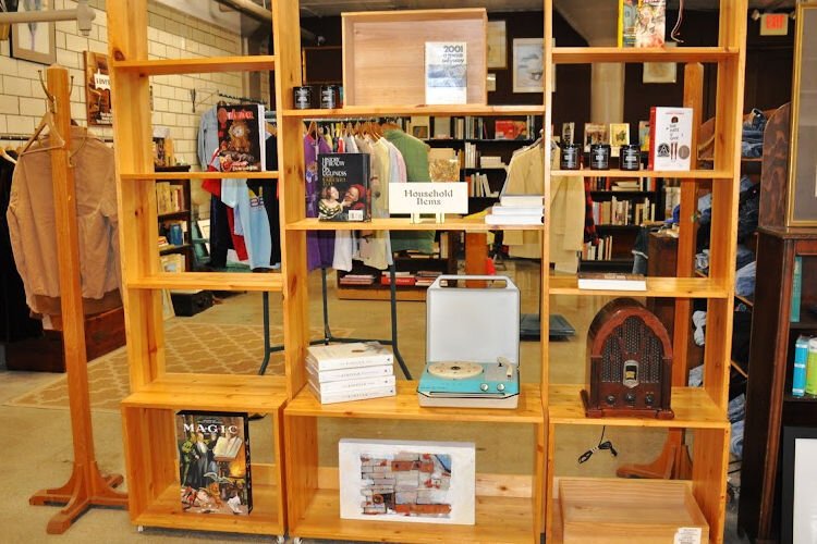 Classic art books are purposefully placed near the vintage clothes section, with vintage Levi’s jeans and other hip clothing sold as emblems of a youth culture. Bobby curates the vintage clothing in conjunction with Take Care Clothing’s Caroline Eyer, who specializes in women’s vintage. Other offerings include a sizeable record collection area, candles made by a Michigan Native American candlemaker, a Harry Potter area, and notebooks sewn by a Navajo seamstress.