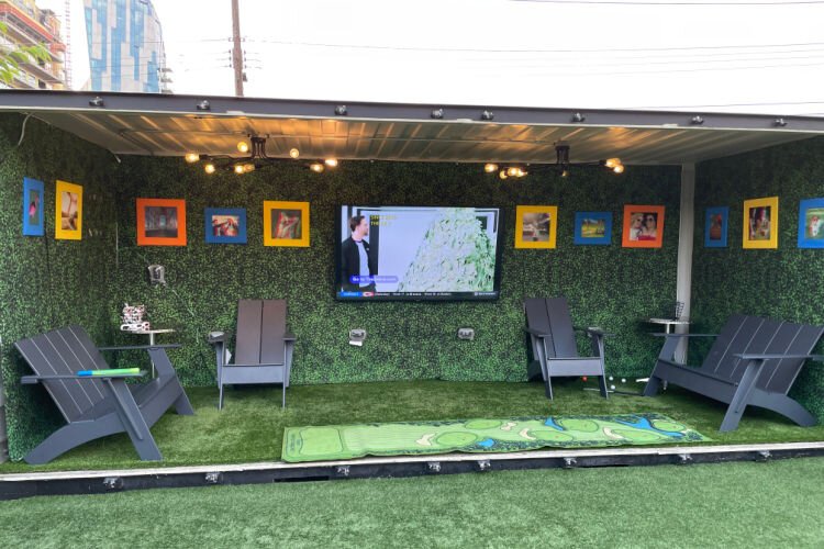 The structure itself is made out of black-painted shipping containers that enclose you in a large square. Some containers are open to offer a more private seating area. If you’re just looking to relax, there is ample lawn chair seating to watch TV or sit with friends.