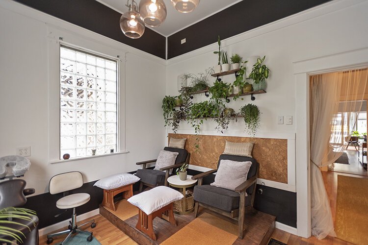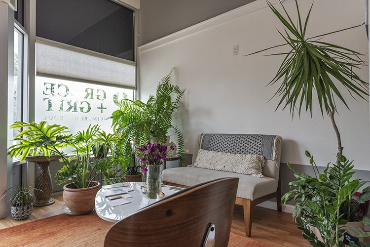 But inside the spa is bliss. The calm atmosphere and soothing energy of both the space and the owner/esthetician, Crystal Grace, makes it easy to tune out the noise. Everything is cream and white with pops of color from plants and throw pillows. A station set up with hot tea features both honey and oil of oregano, and Grace and her massage therapist, Sha-Kim Smith, make their own ice cubes out of ground ginger, turmeric, and pepper.