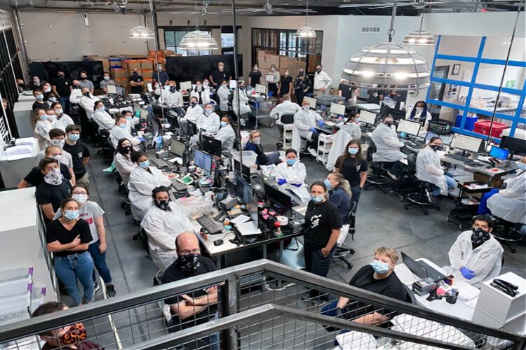 Revenue in one year grew 3,000% as the company in short order won contracts with hospitals, state governments, schools, universities, and retailers who urgently needed help processing the rapidly growing number of Covid tests. Employment grew from a handful of people at the beginning to 450; walls had to be knocked down in its Russell Street workspace to create more room.