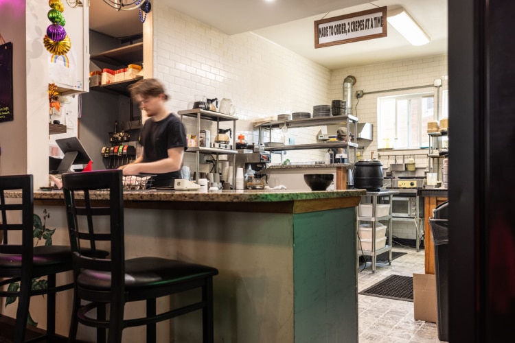 In 2019, they bought the Cracked Pot’s building, which had previously been a real-estate office. Brian and Tracy live in the residential area above Cracked Pot. Retrofitting the building for food service required considerable time and investment, and by the time it was ready to serve pastries and coffee, COVID had thrown public-facing businesses into hibernation. Eventually, the coronavirus cloud parted, and the Teetzens opened The Cracked Pot in June 2022. Its menu offers sweet and savory crepes including a Slow Your Roll, which features cinnamon sugar, cheesecake cream, candied walnuts, and whipped cream.
