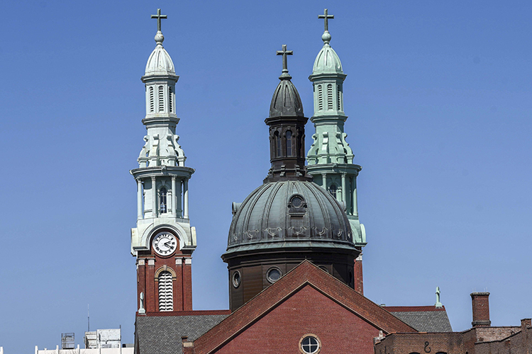 The imposing Gothic spires of St. Lawrence, considered the Mother Church of the Catholic parishes in East and West Price Hill, dominate the neighborhood around Glenway and Warsaw Avenues, where the church has beckoned worshippers for more than 130 years. St. Lawrence’s origins date to 1870, when a red brick building at the corner of Warsaw and Rapid Run Pikes was dedicated as St. Lawrence Martyr, Price Hill’s first Roman Catholic Church. A small school opened that year with just two Sisters of Charity teachers. In 1886, work was begun on the present structure. The superstructure was completed and the new church was dedicated September 30, 1894 by Archbishop William Henry Elder.