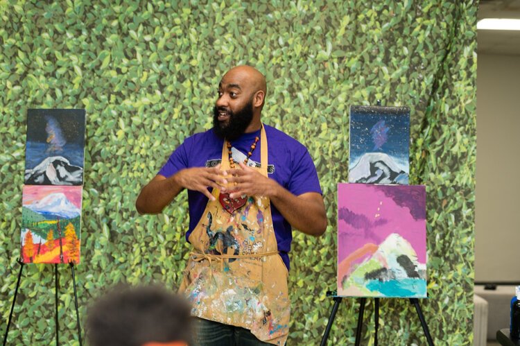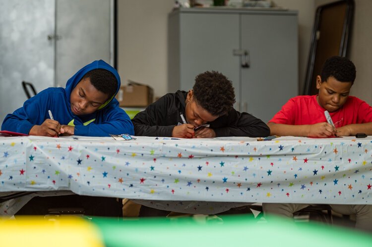 Local artist Christian Drye leads the group in an after-school program, sprinkling bits of wisdom in between his instructions. “When you give people a greeting card, it changes their whole day,” he says. “So think about someone you want to give a card to.”